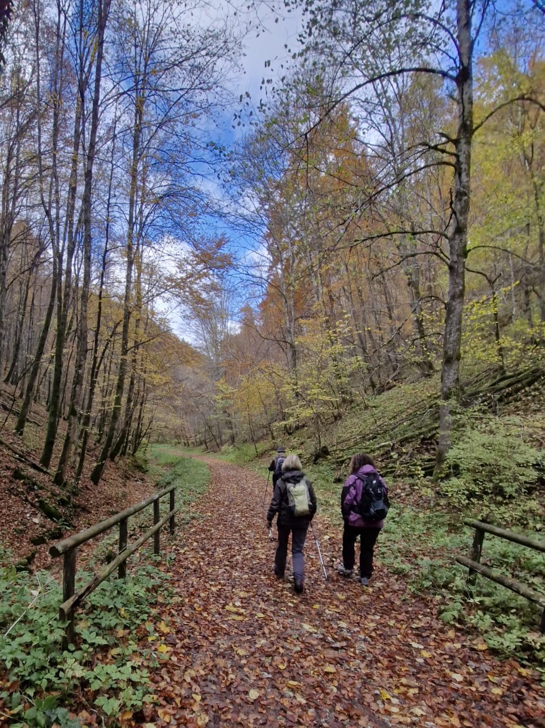 Der Tag begann mit einer interessanten Rundwanderung in Seeburg. Bei kühlen vier Grad machte sich die Gruppe beim Aufstieg über den Höhenweg nahe der Seeburger Steige warm. Einen Überblick genossen wir vom Aussichtspunkt Hoher Fels ins Ermstal und zu den Albhöhen um Wittlingen. Über freies Feld und Waldpassagen ging unser Weg auf Trailfingen zu. Nach einer Rast bei Sonnenschein querten wir nach Osten zum Eingang der Trailfinger Schlucht. Der Herbstwald mit seinen bunten Blättern war im Zusammenspiel mit dem einstrahlenden Sonnenlicht ein Erlebnis. Die Trailfinger Schlucht ist Kernzone des Biosphärengebietes und ein Musterbeispiel für einen Hangschluchtenwald. Am Ende der engen Schlucht erreichten wir den Ermsursprung, der als Wasserfassung leider nicht wie andere Quelltöpfe zugänglich ist. Nach einem kurzen Wegabschnitt in der Ebene erreichten wir wieder den Ausgangspunkt Seeburg.